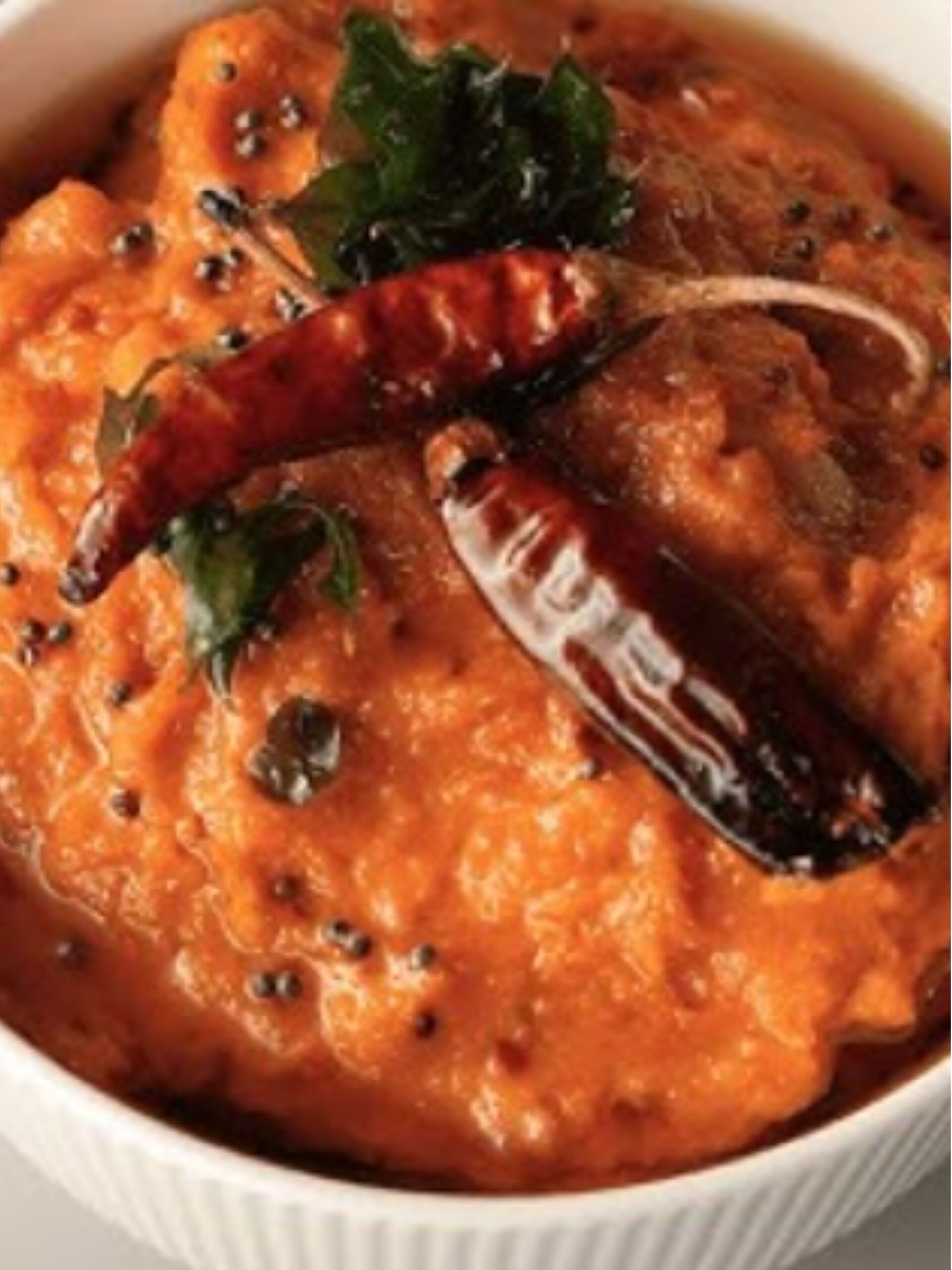 Red Chutney is fiery, tangy, and full of punch with chillies, garlic, and coconut. It’s a classic dosa and idli side that awakens the palate and adds excitement to every bite.