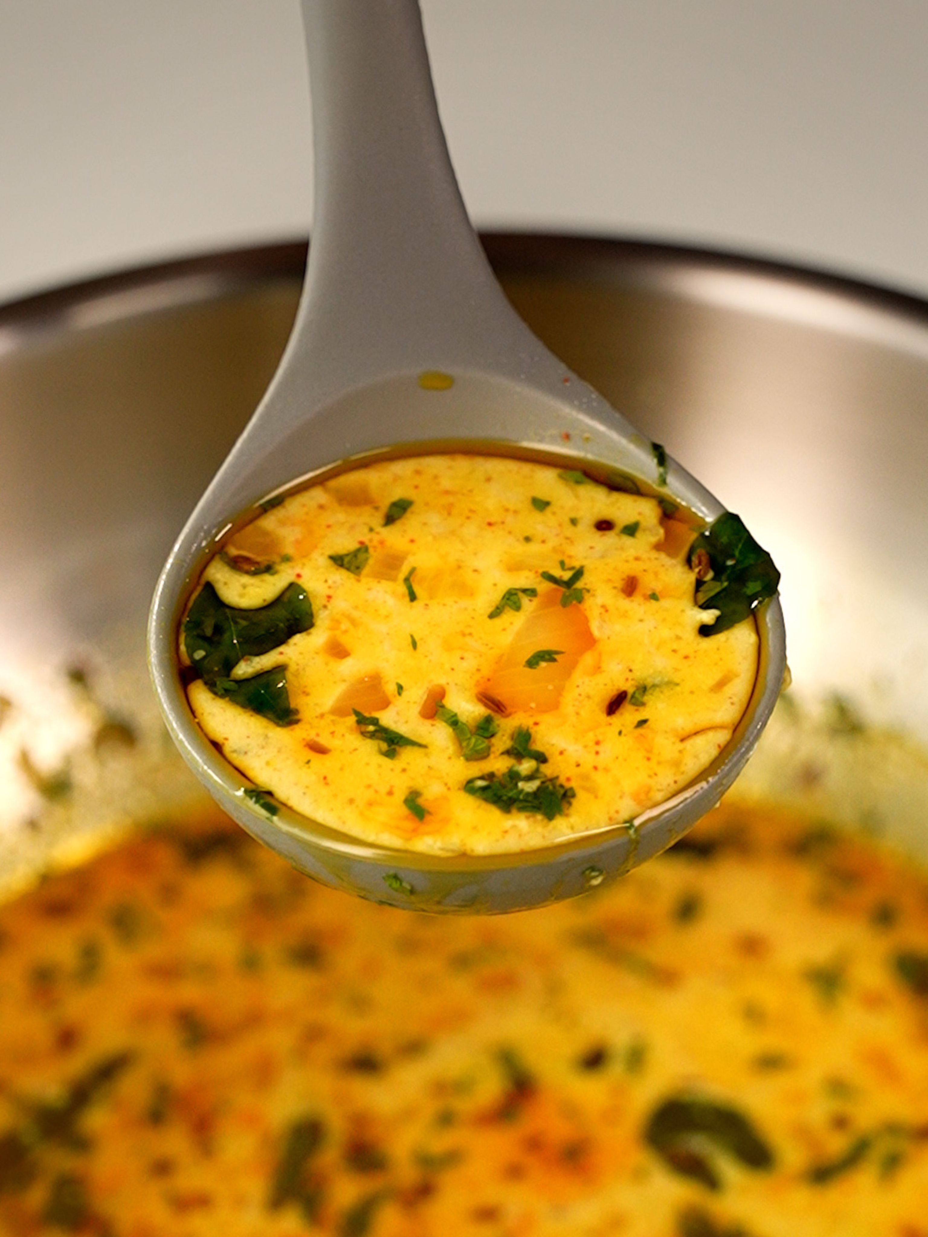 A bold Gujarati preparation where yoghurt meets garlic, chillies, and spices, this dish delivers a punchy, tangy flavour profile, offering a rustic, fiery contrast to milder dahi-based recipes.