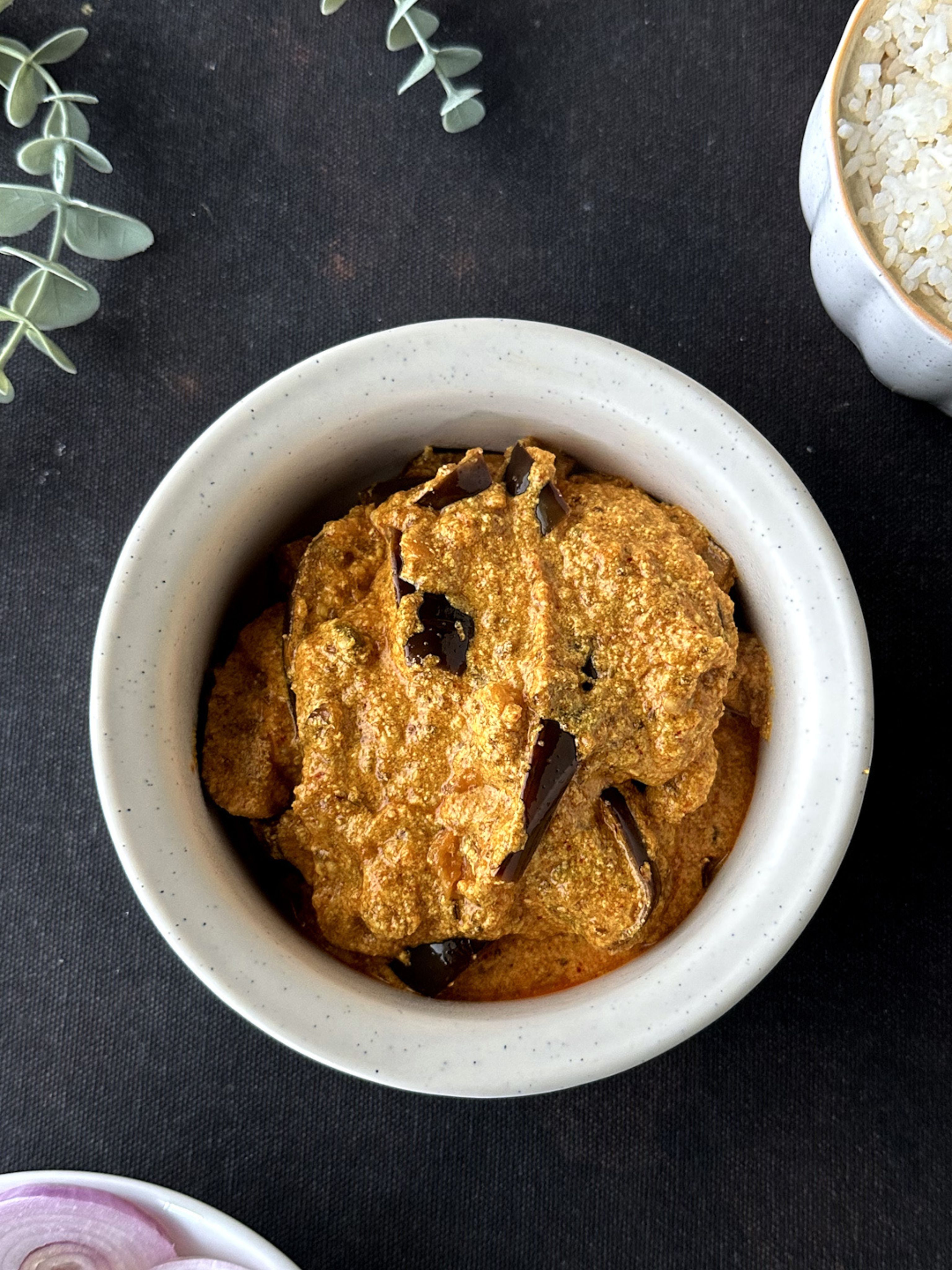 Soft, pan-cooked brinjals are simmered in a tangy, spiced yoghurt gravy, creating a comforting dish that balances smokiness, creaminess, and warmth, perfect alongside rotis or a simple rice meal.